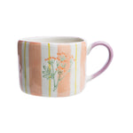 Dank der handgemalten Streifen und dem leicht geprägten Blumenmotiv und der von Hand geformten Tassenform ist jede dieser Tassen ein kleines Kunstwerk. Der farbige Henkel setzt fröhliche Akzente, während das hochwertige Steinzeug besonders fest, wenig porös und widerstandsfähig ist. Mit 300 ml Volumen eignet sie sich perfekt für Kaffee, Tee oder heiße Schokolade und bringt frische Farbe in jeden Moment.